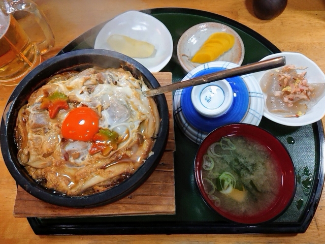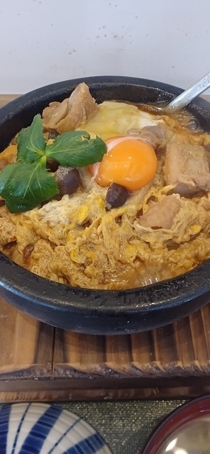 地元の人で賑わうカウンター4席と小上がりテーブル2つの小さなお店。 奥久慈しゃも石焼き親子丼を頂きました。鶏肉の旨味がいかされて工夫を感じます。 付け合わせの刺身こんにゃくも美味しいです。