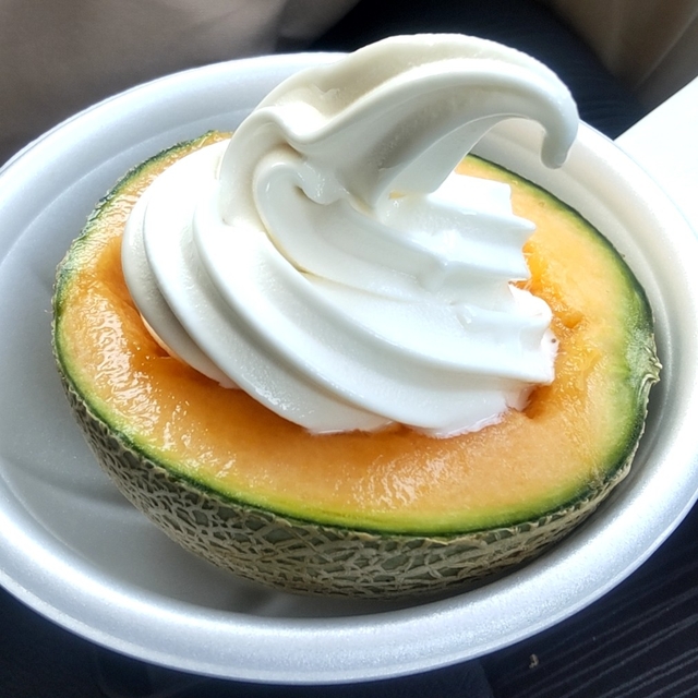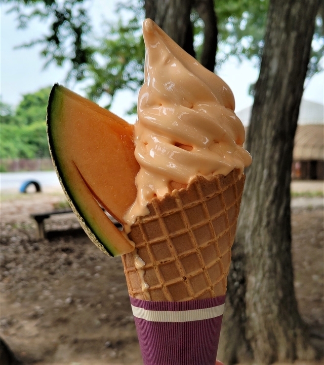 【果肉入りメロンソフト】 今年も食べてきました。結構大きなメロンが付いてきますが、コーンの中にもカットされた赤肉、青肉メロンが入っています。メロンは甘くておいしかったです。(600円)ソフトクリームは暑いと溶けるのが早いので、気をつけて下さい。
