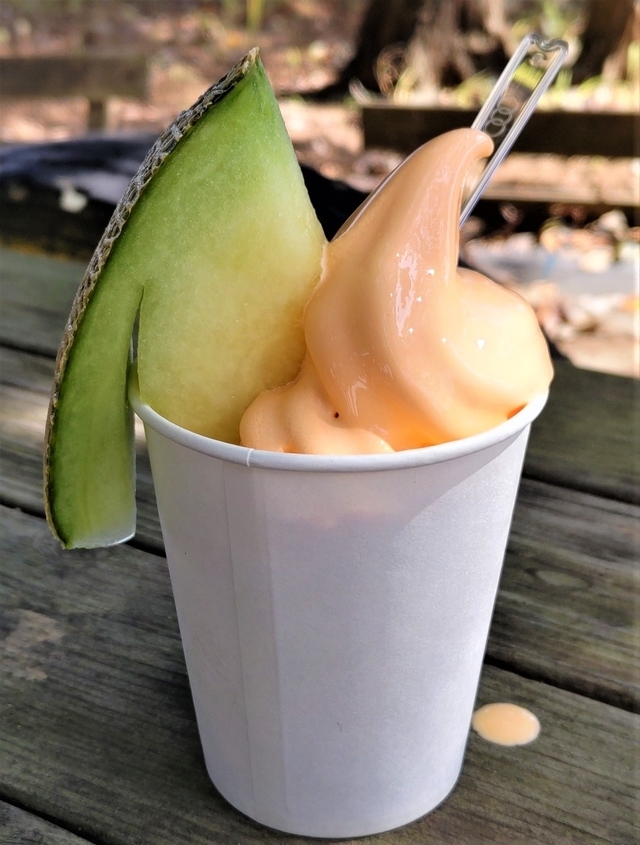 《果肉入りメロンソフト》¥550 メロン感を十分に味わえるソフトクリームです。 ソフトの甘さで、果肉の甘さが分からなくなるので、果肉は最初に食べた方がいいかもしれません。 カップでも対応してくれて、カップの中には、カットされたメロンが少し入っています。 ミックスや果肉なし(¥380)もあります。