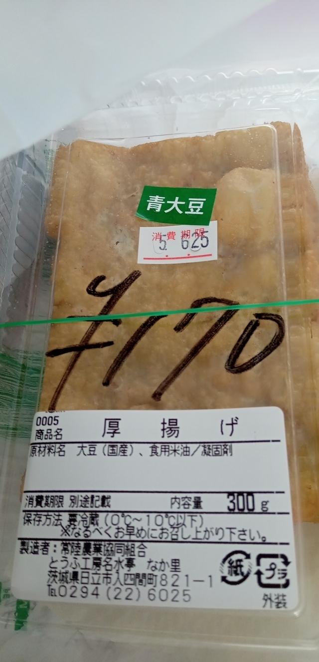 今回は「厚揚げ」「ふわふわ揚げ豆腐」を購入しました。ボリューム感があります。シンプルに食べて、大豆の風味を美味しく味わいたいと思います。