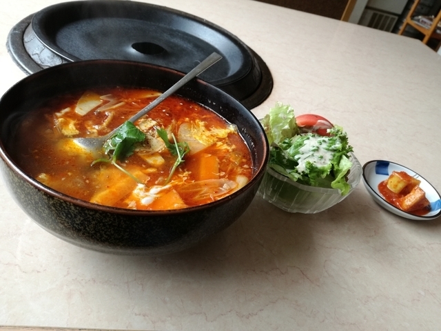 いばナビの情報からランチに伺いました。沢山有るランチメニューからカルビクッパセットを、クッパにサラダとキムチそれにサービスで梨をいただきました。味もチョイ辛でほど良く旨いです。またキムチが甘くおいしかった。値段も安くまた利用させてもらいます。