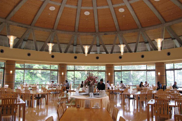 『レストランしおさい』は、国民宿舎「鵜の岬」内にあります。ドーム型の店内は、天井から床、テーブルまで、木肌のぬくもりを感じられる造りになっております。目の前は、果てしなく続く太平洋の大海原。美しく輝く海を見ながらのお食事をお楽しみくださいませ。メニューは、新鮮な海の幸を中心に幅広くご用意しております。