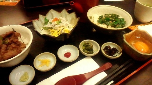 またまたクチコミ失礼します。私の大好きな栄光の丼は、色々な食材を、ひつまぶしのように何度も楽しめます。そのままの味、薬味をつけて、出汁や卵をかけてと変わる味付けですが、出汁であっさりするか、卵でこってりさせるかで仕上げの味も変わってきます。何回食べても飽きませんし、一度に色々楽しめるのはお得です。男性には量が少ないかもですが、女性にとっては少し多い位ですかね。