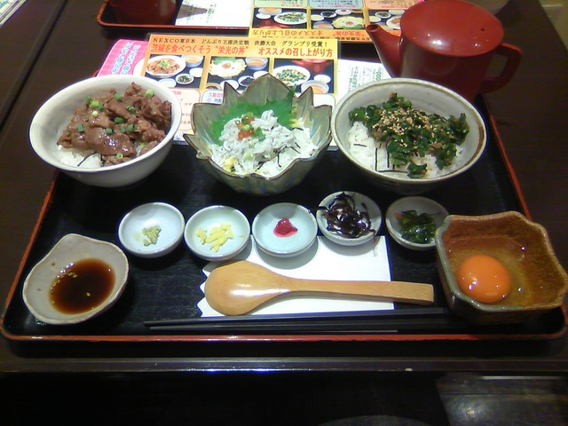 NEXCO東日本のSA/PAの150店舗からエントリーされたプレミアムどんぶり「どら丼(道楽丼)」の中から、一般利用者による投票で選ばれた15店舗が集い、その頂点を決定する大会で初代キングに輝いた「“茨城を食べつくそう”栄光の丼(どんぶり)」。 常陸牛を使った「常陸焼肉丼」、久慈浜丸直送のしらすを使った「久慈浜丸のしらす丼」、新鮮な小美玉市のにらを使った「小美玉にら丼」の3つの贅沢メニュー。 食べる前とは美味しさの予想が真逆で、にら丼が一番美味しいのには驚き。 1200円の価格を跳ね返す旨さ満点の必食メニューでした。