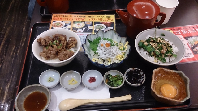 サービスエリア内にあるお店。茨城の食材をふんだんに使った丼がとても美味しい。3種類ありますが、今回は2番目に発売されたものにしました。お肉もお魚も納豆も味わえて大満足のランチでした。