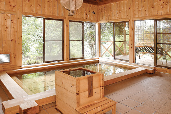 檜風呂はこんこんと湧き出す豊富な湯から浴槽全体に檜の香りが漂い、心身ともに癒されます。山菜や地元の食材で整えられたお膳は、湯上りの体にぴったりの素朴で味わい深いものばかりです。