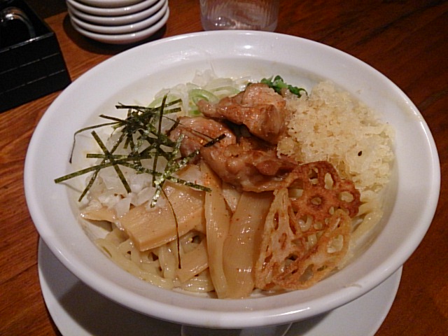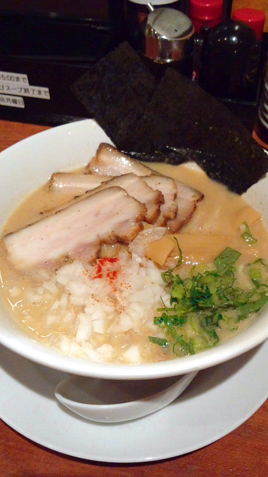 最近流行りのドロ系つけ麺でも食べたいなーと思い、 たまたま飛び込んだら一回でハマりました。 白味噌濃厚つけ麺は極太の麺にたっぷり絡むスープが絶妙。 スープが半分位になったら粉チーズをどうぞ、と言われたのは驚き。(驚くほどは変わらないけど) スープ割りが言わなくても出て来るのも親切。 スープ割りして初めて底に玉ねぎがたくさん沈んでる事に気づきました。 流石に麺には絡まないようです。 また行きます!