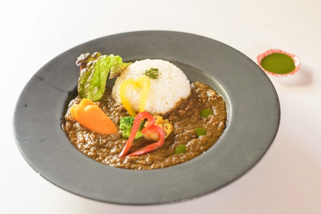 牛バラ肉を加えたカレーに彩り豊かな野菜を合わせました。 お茶のペーストを掛けてお召し上がりください。