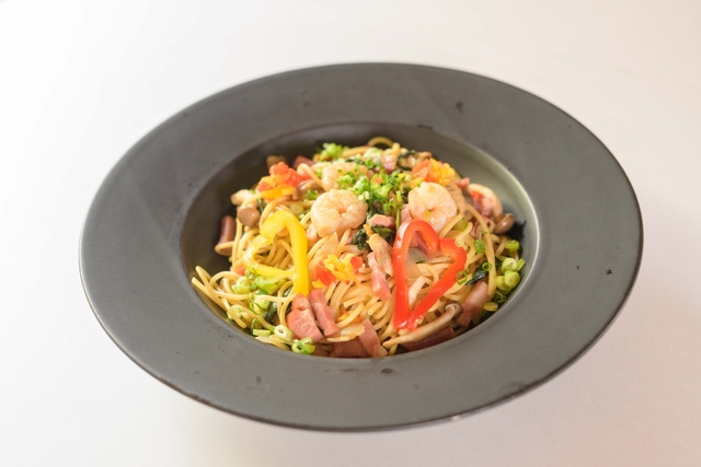 えび&あさりの海鮮と色とりどりの野菜を使用し、特製和風だれで仕上げた具だくさんのパスタです。