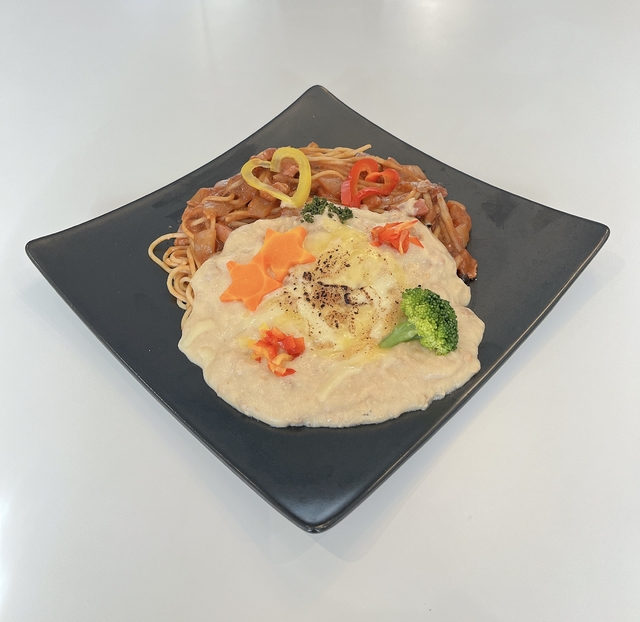 トマトベースのパスタに特製ホワイトソースをかけた濃厚な味わいのパスタです。