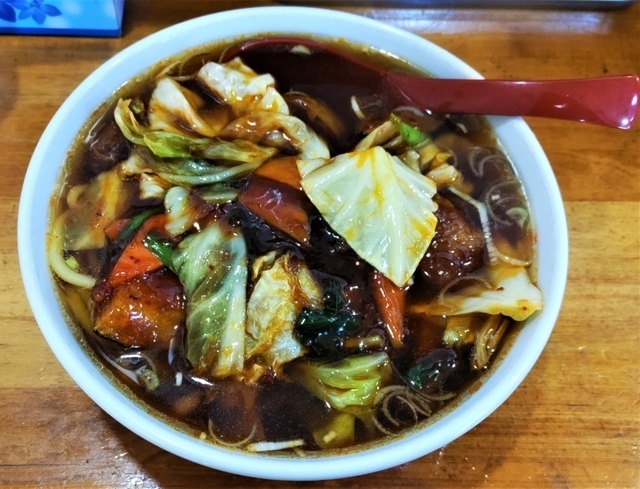 《ホット普通盛り》 850円 原材料等の高騰により、ラーメンの価格も値上がりし、普通盛りで850円。 スタミナラーメンの中では結構太めの麺を使っています。 具材は基本のもので、餡は甘さの方が強い感じです。 少し辛さが物足りなかったので、唐辛子をかけて、おいしくいただきました。
