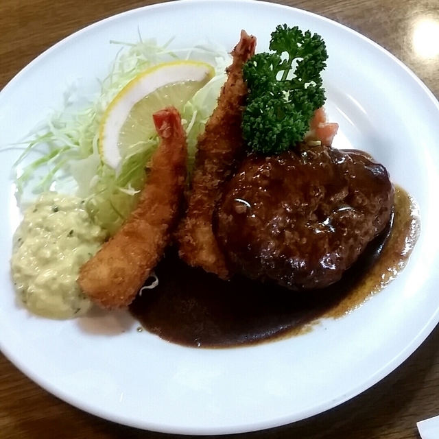人気洋食店 大かわ ◆デラックスランチ950円 日替りのおかずを提供。今日は、プリプリのエビフライとジューシーハンバーグ。 おかずは小ぶりだが美味しい品。日替りなのでリピートOKです。