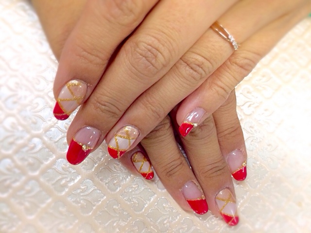バイアスチェック×赤のフレンチ☆ゴールドラインとさりげなーいストーンがポイント!色んなデザインを提案してくれますよ〜!!