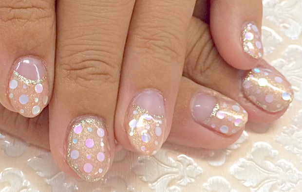 今月はちょっと大人めの色、その名も「麗しのシルク」をベースにホロでドット柄風に♪短めのネイルが久々で、動き易い~☆