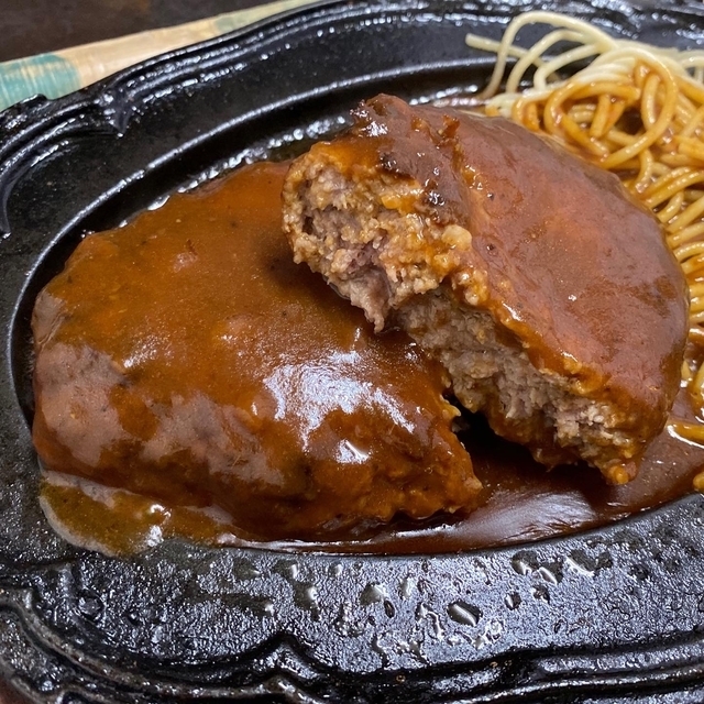 お昼にハンバーグ定食をいただきました。 手のひらサイズのハンバーグはアツアツ鉄板で供され、デミグラスソースがたっぷりかけられています。 具沢山の味噌汁が付いて満足・満腹です。