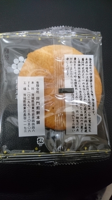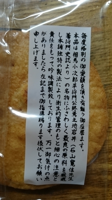 昔ながらの,固い煎餅が好きな方には,最高の一品です。 パッケージの裏面に,由来が書いてありました。将門公の終焉の地なんですって。
