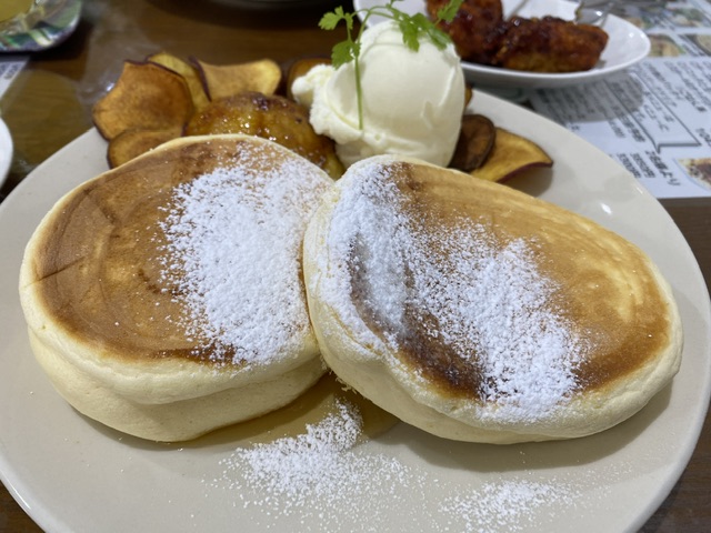 パンケーキを食べたくてきました。シュワふわ系のパンケーキです。季節限定サツマイモ、とても美味しかったです。お昼時だったので、甘辛いチキンも頼みました。コーヒーはアメリカン?少しあっさりした感じ。叶うなら、甘めのパンケーキなので、少し苦味のあるコーヒーがあうかな、と感じました。
