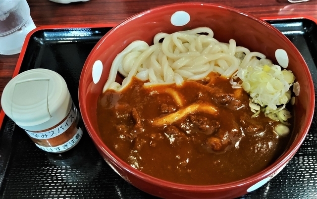 《ジャワ風カレーうどん》880円 やや柔らかめの茹でたてうどんに、熱いビーフカレーがかかっています。 辛さはあまり感じません。(個人的感想です。) なので、辛みスパイスをかけていただきました。 かけすぎ注意と記載してありましたが、かけても辛さはそれほど強くなく、何度もかけておいしくいただきました。
