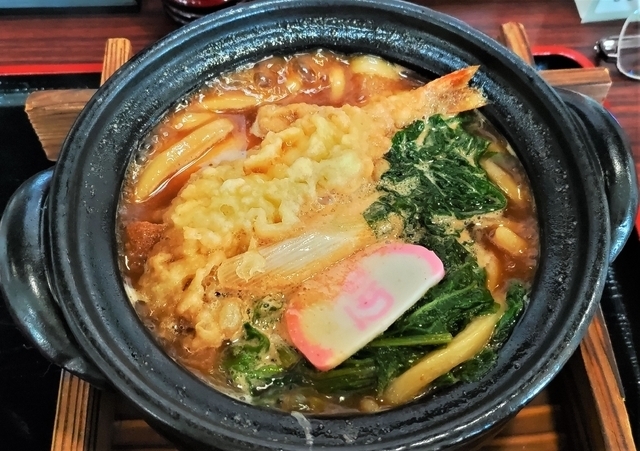 【海老天入り味噌煮込みうどん】1120円 3種類の鍋うどんがありました。「鍋焼きうどん」「ジャワ風カレー煮込みうどん」と今回いただいた「海老天入りみそ煮込みうどん」です。 いずれも1120円で、1玉~1.5玉を選ぶことができます。 具材は海老天がメインですが、ほうれん草や玉子も入っています。その他に小さいですが、大根、しいたけ、こんにゃく、里芋などの野菜も入っていました。 味噌スープもやや甘めな感じでおいしくいただきました。
