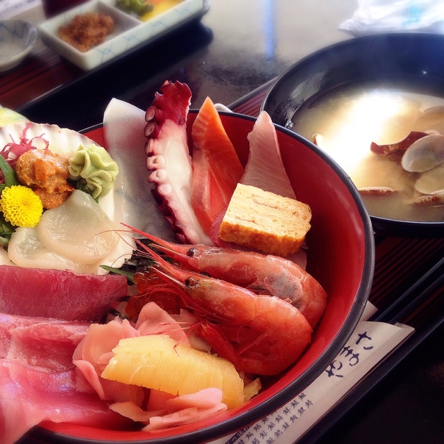 市場へ来るとだいたい、こちらのお店で食事します。海鮮丼は小鉢としじみの大きな味噌汁がついて1200円。大満足です!いくら丼はハーフサイズの600円のものでも女性には十分すぎる量ですよー!海も一望出来ますしオススメです。