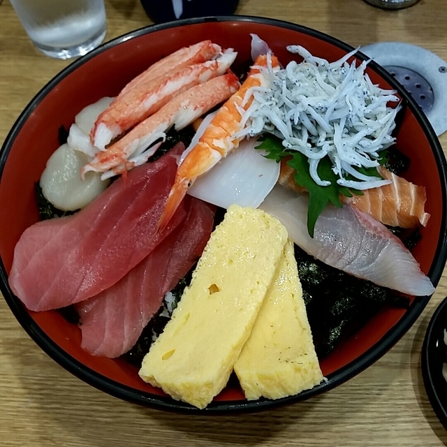 今回は土日限定の2階で。 ◆海鮮丼壱番1,000円 蟹、エビ、しらす、マグロ いか、ホタテなどなど。 海鮮系が大量に入り、 お吸い物がついて、 1,000円という値段と、 ボリュームにビックリです。