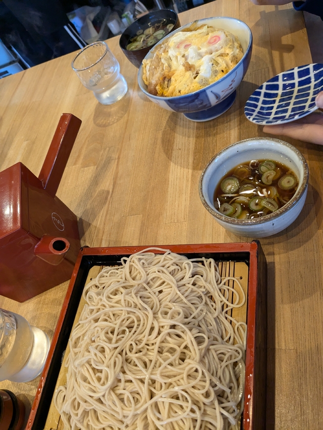 和の雰囲気の入り口が良い感じです。外国の人を連れてくるのに良さそうな店構えかも。駅からすぐそぱで、駐車場もあり。細麺のお蕎麦が美味しかったです。この日頼んだ天丼、白身魚の天ぷらが2つでした。カツ丼や天丼には味噌汁でなく、あたたかいお蕎麦がついてきたのが嬉しい!漬物もついていて美味しかったです。 ちなみにレシートはありませんでした。