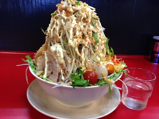 2015年7月14日 昼 夏の限定メニューの告知を聞いて訪問。 「冷やしパンチ4」にヤサイマシマシ、麺300g、カレーマヨ、パンチ材トッピングで注文、着丼され唖然!すごい標高だ!と思いながらもいただきました。 麺の上は生野菜サラダ状態でしばし野菜のみいただき、そして麺へと。。。 ボリューム満点に加え創造力豊かなメニューでした。 ご馳走様でした。
