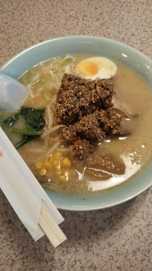 いつも味噌ラーメンですが、今回は前から気になっていた濃厚白味噌ラーメン?だったかなを食べました。 普通の味噌ラーメンよりももやし、コーン、ひき肉が追加されてます。 もやしでボリュームがでてますが、ひき肉が微妙です。 見た目に反して味に変化がないし、食べてるうちにどこかへ行ってしまいました。 値段も860円ぐらいだったかな??