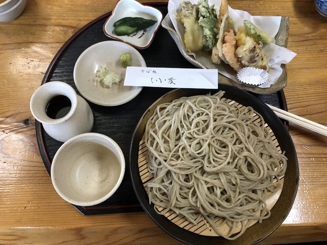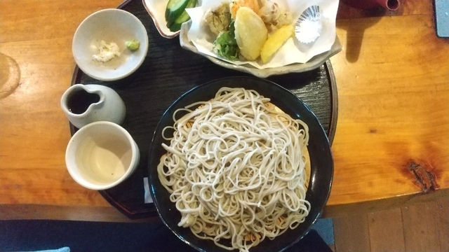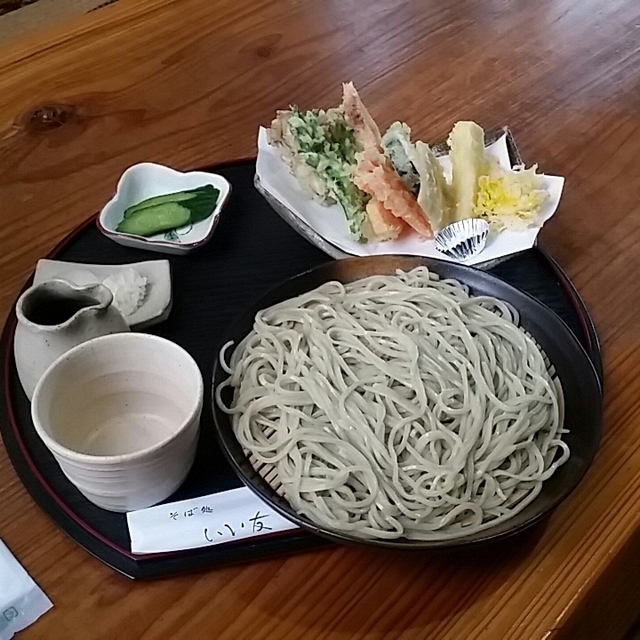 13時過ぎでお昼を過ぎていたためか、ゆっくり過ごせました。 注文したのは野菜天ぷら付きのざる蕎麦で、お店の人から『大盛にしますか?』と聞かれましたが、どの位の量になるか分からなかったので普通盛で頼みました。 注文した後、先客の人が大盛は2人前になると話していたのを聞いて、注文しなくて良かった、と一安心。 天ぷらは、揚げたてサクサク、初めて食べる林檎の天ぷらもあり、良かったですね。 蕎麦は、県北にありがちな田舎蕎麦では無く、自分好みの蕎麦でスルスルと食べられました。 普通盛でも満腹になるくらいボリュームがありました。