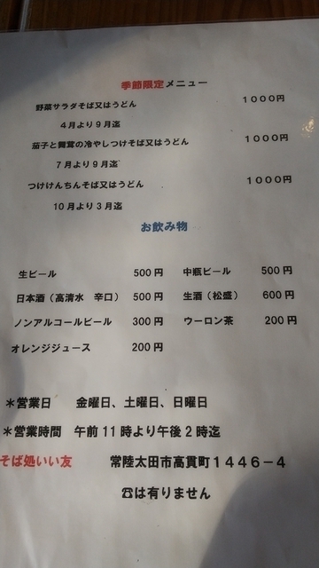 夫婦で蕎麦が好きなので食べたくなると高速飛ばして出かけます。主人は天ざるを注文しましたが、そばはみずみずしくてこしがあり、天ぷらも種類が多くてこの前はリンゴの天ぷらや蕎麦の天ぷらなんかも入ってました。私はサラダ蕎麦を食べましたがとってもボリュームがあって美味しくて満足でした。注文して蕎麦が来るまでの間に蕎麦がきのサービスもありこちらも楽しみのひとつです。とても美味しくて安いので是非おすすめです。常陸大宮市だったかな?出かけた時にこちらの契約してる蕎麦畑の看板をみたことがありました。とてもこだわりを感じました。