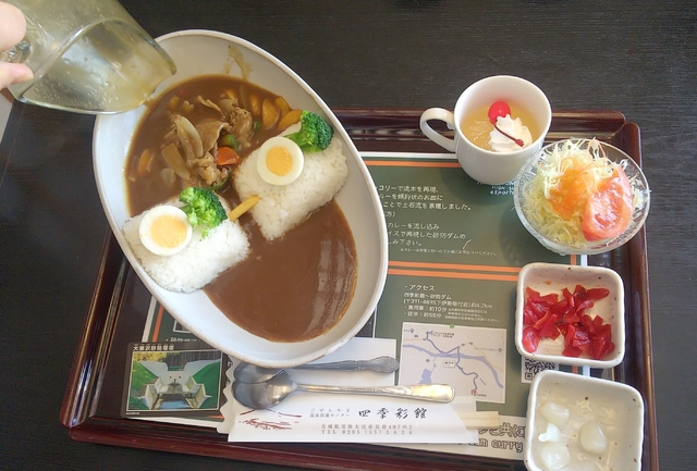 温泉気持ちよかったです!食堂で大栗沢砂防ダムカレーセットをいただきました。お野菜たっぷり!フライドポテトがアクセント。ダムのカードとランチョンマットが付いてきました。ボリュームもあるし、美味しかったです!
