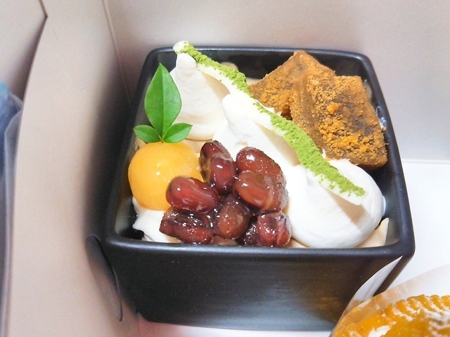 買ってきてもらったので名前はわからないです・・・ 抹茶のムースで上にはわらびもちなども乗っていて和のスイーツです♪♪ 器もしっかりとした器なので洗って小鉢に使います(笑)