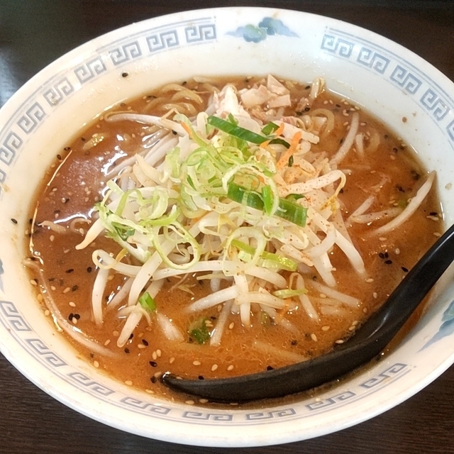 人家疎らなロードサイドのお店ですが、木立の陰に隠れた立地で見落としやすいです。日曜の遅い昼に初訪問すると前客1人・後客3人。オススメNo.1の味噌らーめんに自家製餃子(3個)を注文しました。スープは赤味噌仕立てで、北海道産味噌・紅一点とのこと。味噌特有の甘さはあるものの、ちょっと塩辛さが立っているかな。豚骨・鶏ガラの合わせ出汁らしい。具は豚叉焼のチップを混ぜ込んだ茹で野菜(もやし/刻みネギ/ニンジン)の小山。白黒胡麻も散らされています。ちょっと塩辛いのでスープ完飲とはなりませんでした。餃子は自家製ですが、特に特徴があるようではなく、普通の仕上がりでした。
