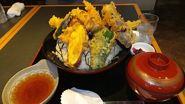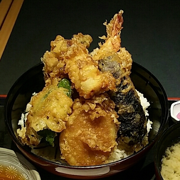 ◆おたふく天丼小1,200円 盛りのよさで有名なお店。 今回は名物天丼の小で。 小でも普通の大盛レベル。 天ぷらは、 海老、穴子、野菜が数種類。 これがどれも美味しく、 天ぷら食べるだけでも良い。