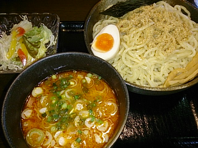 ●正油つけめん中800円 麺は太麺のややかため。 スープは、豚と鶏のWスープで、 和節が加わり濃厚に。 しかし、以外とあっさり系。 トッピングには、玉子、のり、メンマ。 スープ割りも、とんこつと 鶏ガラのWスープです。