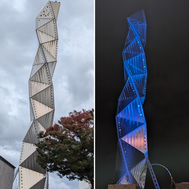 水戸芸術館シンボルタワー近くでの用事ついでに展望台へ行きました。 テレビで水戸を中継する時に見てましたが、 生では初めてです。 建物が独特で圧巻でした。 夜はライトアップでキラキラしていました。