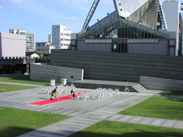 この場所で結婚式をしました、懐かしいなぁ。 レストランウェディングで、人前式を広場で行いましたよ。 屋外なんでその辺散歩してるおばちゃんから拍手されたりして恥ずかしかったけどね。