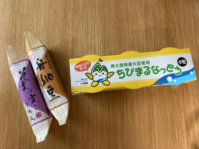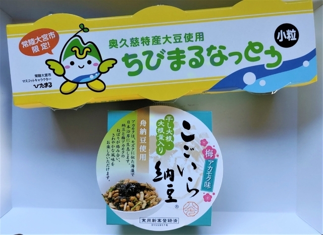 《こごいら納豆》324円 舟納豆に、干し大根、大根葉が入ったもので、3種類あります。 100gと値段の割に少ないですが、おいしいのでおすすめです。 《ちびまるなっとう》216円 30g・3カップ入りの常陸大宮市限定販売の普通の納豆です。 常陸大宮市の特産品に認証されています。 道の駅常陸大宮「かわプラザ」でも購入できます。