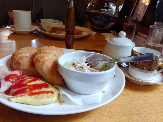 休日ということもあり、9時には順番待ちの方々がなん組もいらっしゃいました。 本日オススメのコーヒーとクロワッサンのモーニングセットをいただきました。クロワッサンはふわぁふわぁサクサクで、コーヒーもサイフォンで出され贅沢な時間でした。 少し残念だったのは、提供迄の時間とセットのサラダ。 次回は、ケーキセットを頂きながら、ピアノの生演奏の時間に伺えたら最高です。