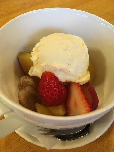 和の彩りセットを単品でいただきました。バニラアイスと一緒に、いちご、さつま芋のレモン煮?や、栗、ぶどう、甘納豆、が入っていて食べ応えのあるスイーツで美味でした。