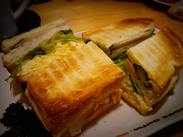 ミックストーストサン♪ タマゴ、きゅうり、レタス、ハムのサンドイッチです。 4つにカットしてあります♪ お好みの数にカットもしてくれるみたいです☆