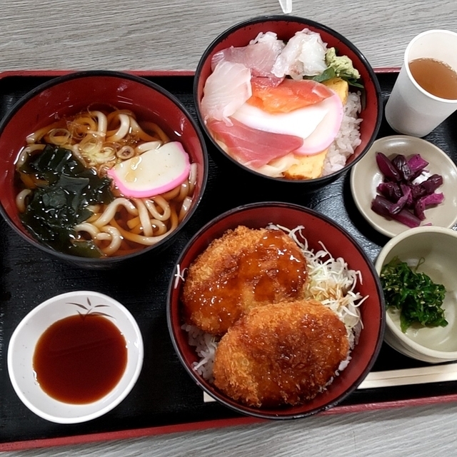 ドライブインの定食 勘太そば ◆和牛コロッケ満腹セット1000円 海鮮丼とコロッケ丼、うどんの組み合わせの満腹セット。 新鮮海鮮刺身と揚げたてコロッケは絶品。