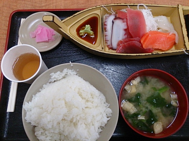 日替わり刺身定食がおススメ! お刺身3点盛にご飯・味噌汁が付いて500!! 鮪は赤身でまったりしてて美味! ご飯大盛りはほんとに山盛りです。ご注意下さい♪