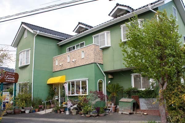 グリーンの建物を植栽たちが囲む、癒しの雰囲気。