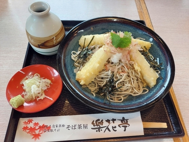 蕎麦が食べたくて「楽花亭」に初めて行きました。大きな落花生のオブジェが見えて落花生のお土産屋さん?と思いきや蕎麦屋もありました。蕎麦屋とお店が併設されているんですね。メニューを見ながら悩み「あげもちそば」にしました。冷たいそばに揚げもちと辛味大根をのせていただくと本当においしい~~~( *´艸`)熱々の揚げもちにそばつゆをからめて辛味大根をのせ食べるとこれだけで10本は食べられるけど悲しいかな4本しかありません(-_-;)あ~もっと食べたい!!!食後は落花生をお土産に買いました。試食もできたのでおいしい落花生を買うことができました。