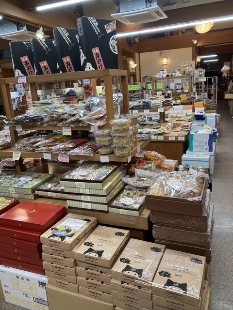 巨大な落花生のオブジェは道路から良く目立ちますね。 地元産の落花生だけでなく、いろいろなお菓子や漬物、蕎麦、酒等々品揃えが豊富です。 地元の方もかごを手にたくさん購入されていました。