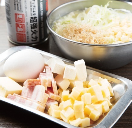 生卵、3種類のチーズ、バター、ベーコンをふんだんに使い、最後にパルメザンチーズとマヨネーズ、黒胡椒をかけてバーナーでカリッと!食欲をそそる香りとふわっふわのカルボナーラ風味もんじゃ(1296円)は、ココでしか食べられません!ビールとの相性は抜群♪
