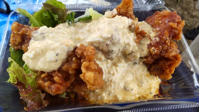 イベントに来られていたキッチンカーで、タルタル南蛮(600円)を購入しました。 大きめのから揚げが3つが甘じょっぱいタレをまとい、その上に自家製タルタルがたっぷりかかっています。 自家製タルタルは、いろんな具材とともに、細かくしたゆで卵がけっこう入っているようで、ふんわりなめらかで抜群においしいです。 タレもキンキンしてなくて、タルタルとも絶妙なコンビネーションでから揚げを引き立てています。 から揚げが3個なので、50円値上げして、もう1つ多くすれば、味は抜群においしいので120点だと感じました。