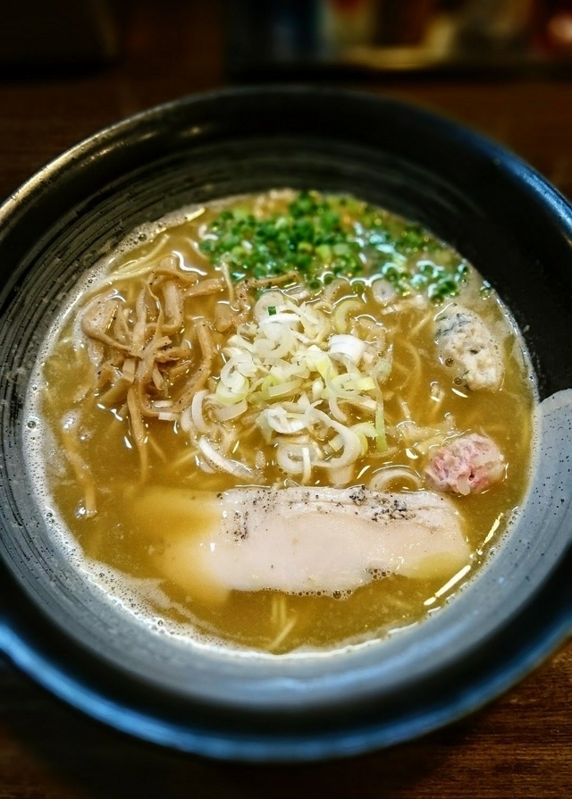 昼再訪ですが、先客5人待ちの相変わらずの満席状況。今回は初味わいの醤油味で純鶏白湯を注文。併せて水餃子(5粒)も試しました。塩味でも醤油味でも相変わらず濃厚な鶏スープが美味しい。具も塩味のものと同じ鶏肉団子2個、鶏叉焼2枚、メンマ、ネギ、ワケギ。水餃子は茹でた餃子を湯切りしたもので、餡はやはり鶏肉主体。タレとしてレモンペッパーも一緒に来ました。前回焼餃子で試した岩塩とはまた違った味わいで美味でした。