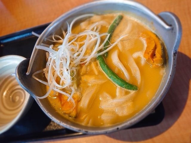 冬季限定という豆乳 野菜ほうとうをいただきました。大きなカボチャがはいったまろやかで美味しいスープは身体が温まりますね。